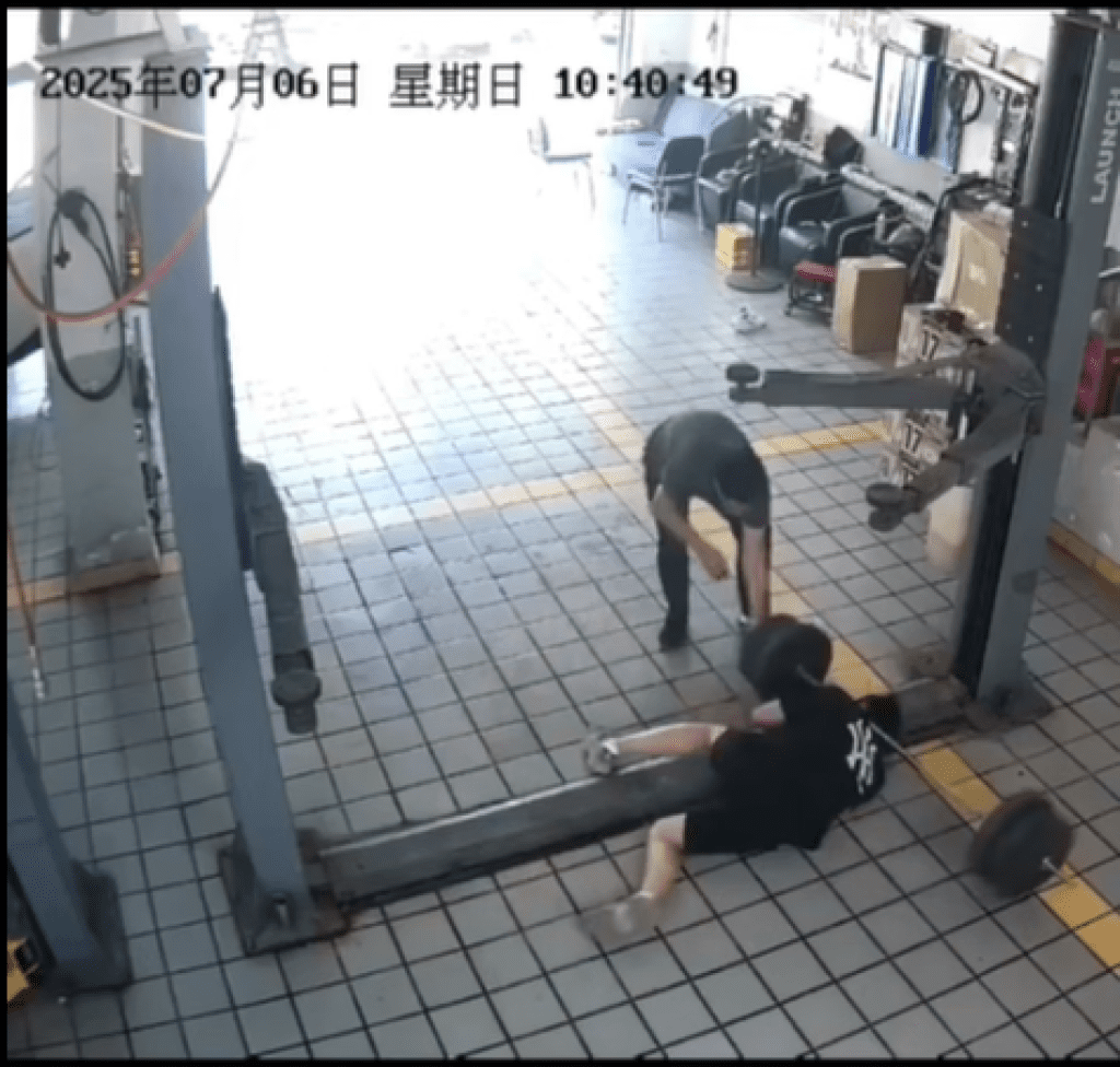根據陸媒體報導,7月6日,遼寧瀋陽一處汽車修理廠發生意外,該修理廠擺有健身設備,男子在舉槓鈴做深蹲時,疑因腳在磁磚上一時打滑,槓鈴瞬間壓脖子上2秒多,導致整個人被重重壓倒在地。事發的監視器影片也在網路上瘋傳。