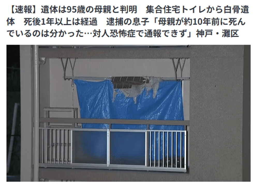 6月下旬,在日本神戶市灘區一處集合住宅內發現的白骨化遺體,經確認為因涉嫌遺棄屍體而遭逮捕男子的95歲母親。該住宅房間為垃圾屋狀態,男子向警方表示:「我知道母親是在約10年前於廁所內過世,但因為我有社交恐懼症,無法報警。」