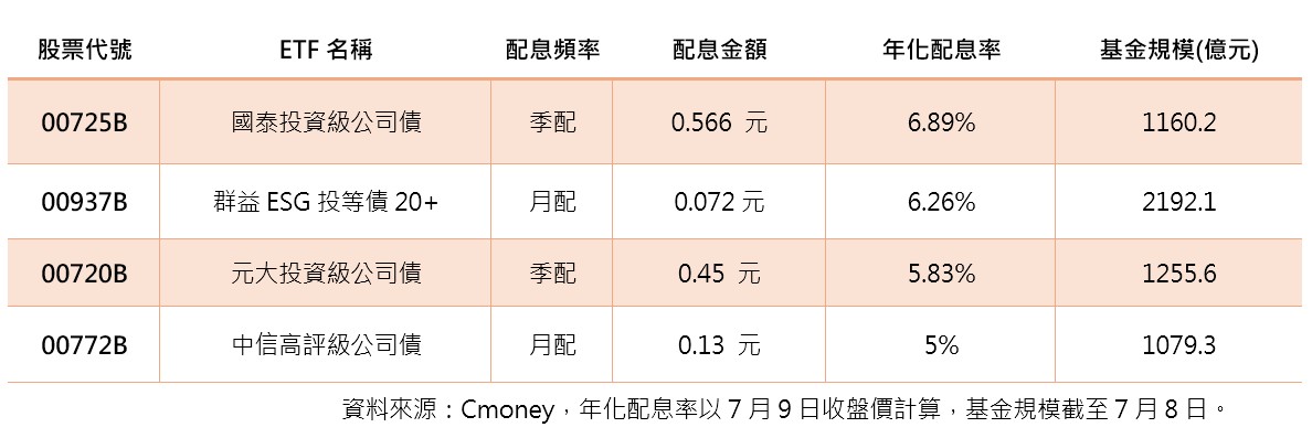 以規模超過新台幣千億元的四檔債券ETF來說,包括群益ESG投等債20+(00937B)、元大投資級公司債(00720B)、國泰投資級公司債(00725B)、中信高評級公司債(00772B),年化配息率5%起跳。