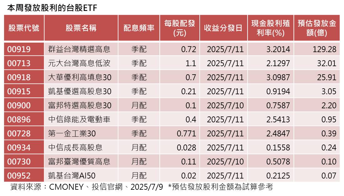 另一頭,台股ETF本週有10檔發放現金股利,金額合計194.21億元,即將在明後天入帳,可望對台股挹注資金活水。