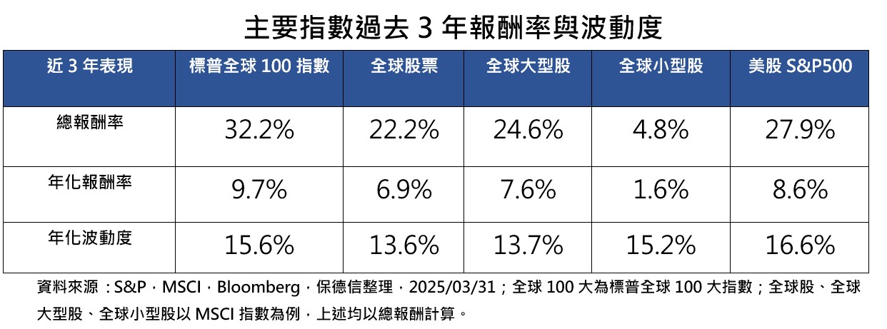 保德信比較主要指數過去3年報酬率與波動度,可見到標普全球100指數表現明顯勝出,不論在總報酬率32.2%、年化報酬率9.7%,皆勝過美股S&P 500指數的27.9%、8.6%,以及全球股票的22.2%、6.9%,即使是比較全球大型股同期的24.6%、7.6%也同樣勝出。
