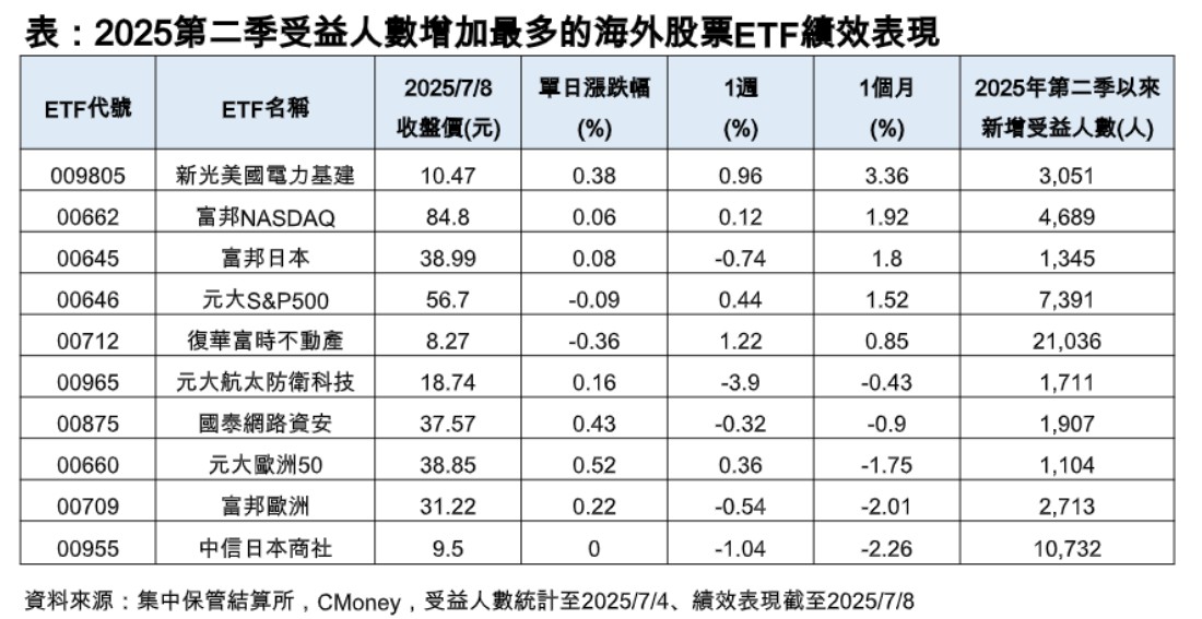 再看受投資人青睞的海外ETF,統計第二季以來截至7/4,受益人數淨增加的當紅投資主題,除科技股,其他主題包括「電力基建」、「航太防衛」、「網路資安」等類科技ETF,累積受益人數也淨增加6669人,顯示科技周邊相關次產業,近期獲不少投資人青睞。
