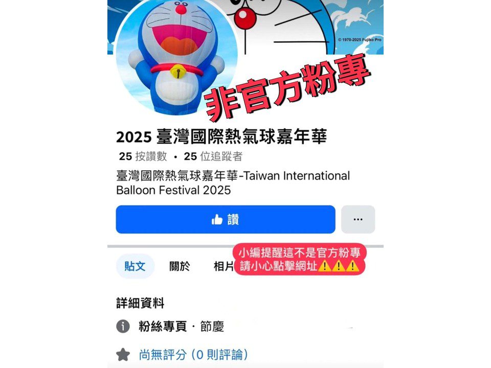 臺東縣政府主辦「2025臺灣國際熱氣球嘉年華」,自7月5日起在鹿野高台盛大展開,今年首次與哆啦A夢IP合作的限量造型熱氣球人氣夯,開幕日即吸引逾3萬名遊客,但近期出現許多疑似詐騙網站,要求民眾加入LINE會員,縣府提醒民眾千萬不要輕易提供個資,目前並未透過任何網路平台銷售哆啦A夢官方商品,或提供搭乘熱氣球優惠。縣府說明並重申,目前「臺灣國際熱氣球嘉年華-Taiwan International Balloon Festival」為唯一官方臉書,追蹤人數已高達26萬人,請民眾多加注意。