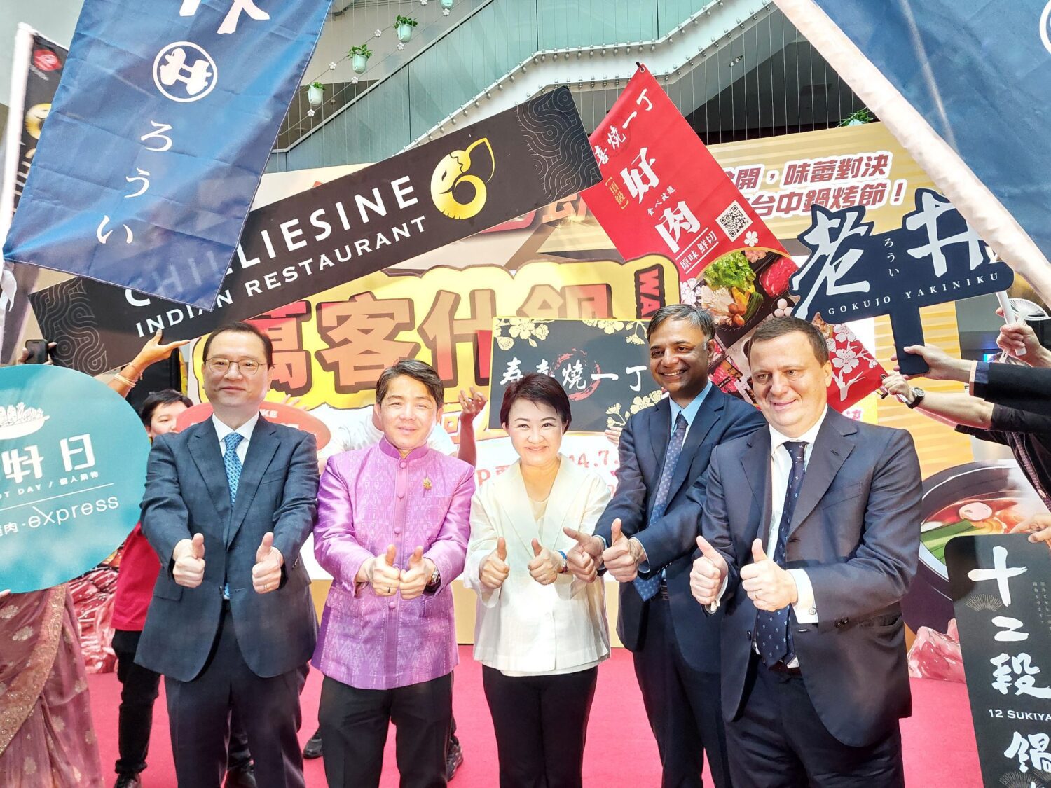 台中市長盧秀燕昨(11)日出席「2025台中鍋烤節」活動記者會,會中邀請韓國、泰國、印度、義大利四國駐台代表到場力挺合影。(圖/記者游穎達攝)