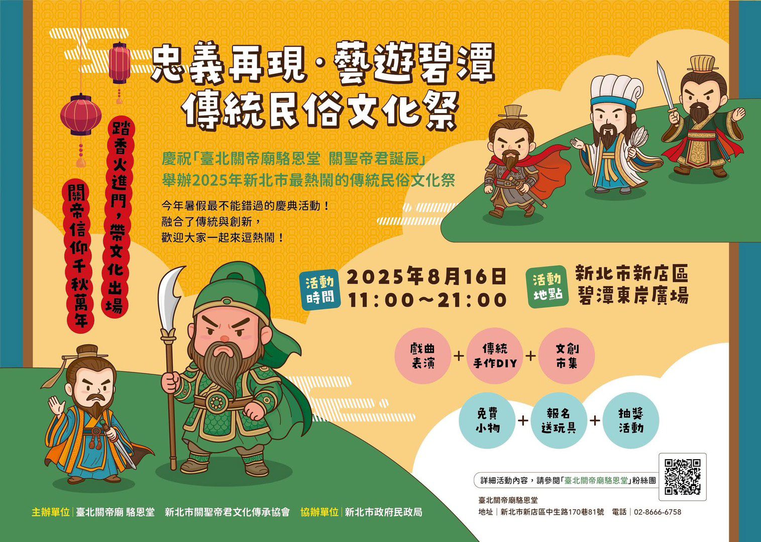 2025年新北市傳統民俗文化祭活動時間為8月16日11:00至21:00,地點就在新店碧潭東岸廣場,邀請大家一起號召大小朋友,參與這場結合傳統與創新的文化盛事,如需更多活動詳情,可參閱「臺北關帝廟駱恩堂」粉絲團。