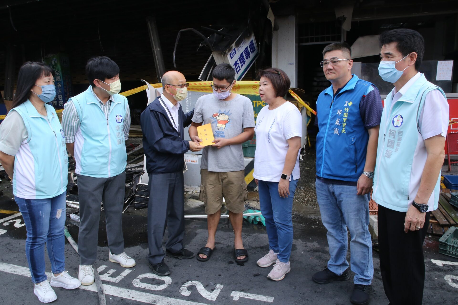 嘉義市政府消防局昨(24)日深夜11時許接獲多通報案電話,西區友愛路、興雅路口發生火災,大火延燒包括豆奶攤、弘安藥局、85度C等10間店面受損。今日上午火調鑑識人員進入封銷區展開火場鑑識作業。市長黃敏惠獲悉十分關心受災戶現況,因赴日進行設計產業交流,由秘書長陳永豐代表前往火災現場發放5000元慰問金,並責成市府團隊全力協助受災商家,早日重新營業,恢復正常生活。