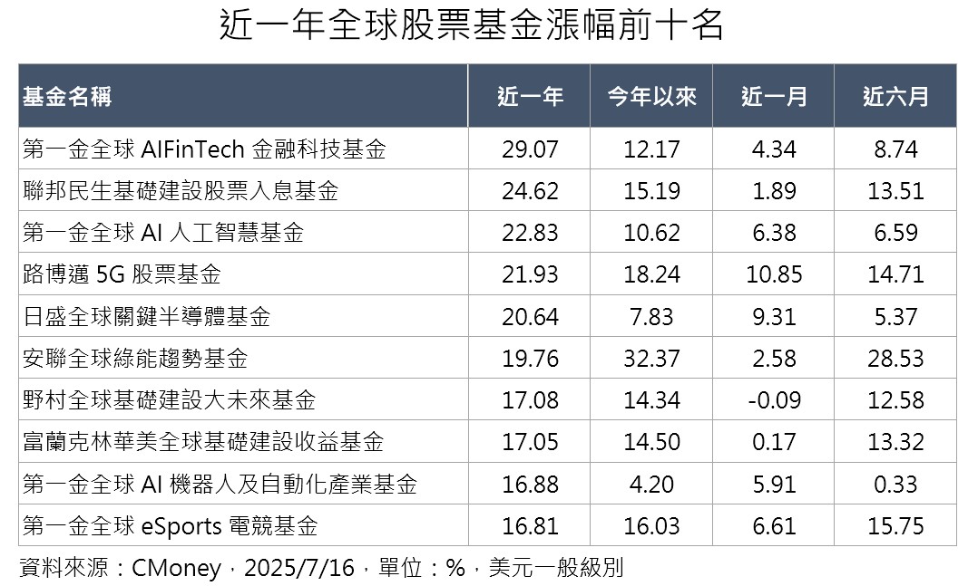 檢視近一年的全球股票型基金漲幅前10名,主要集中在金融科技、基礎建設、AI、科技主題,其中,漲幅最高的是第一金全球Fintech金融科技基金,累計上漲29%。