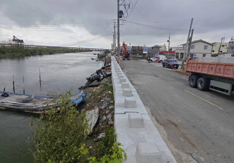 回顧丹娜絲颱風來襲期間,七股地區觀測到最大平均風力13級、陣風高達16級,巨浪穿越青山港汕,沿大寮排水溢堤進入西寮社區,造成短暫淹水。為防止類似災情重演,市府採用混凝土預鑄塊堆疊工法,節能、高效且施工迅速,確保整體加高作業能在最短時間內完工。