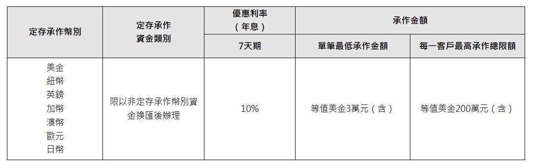單筆最低承作金額為等值美元3萬,每一客戶最高承作金額為等值美元100萬。
