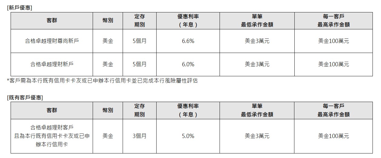 如果是滙豐「卓越理財尊尚」及「卓越理財」新客戶,自即日起至9月30日,可享美元定存5個月、年息最高6.6%的優惠;現有「卓越理財」客戶亦享美元定存 3個月、年息5%。