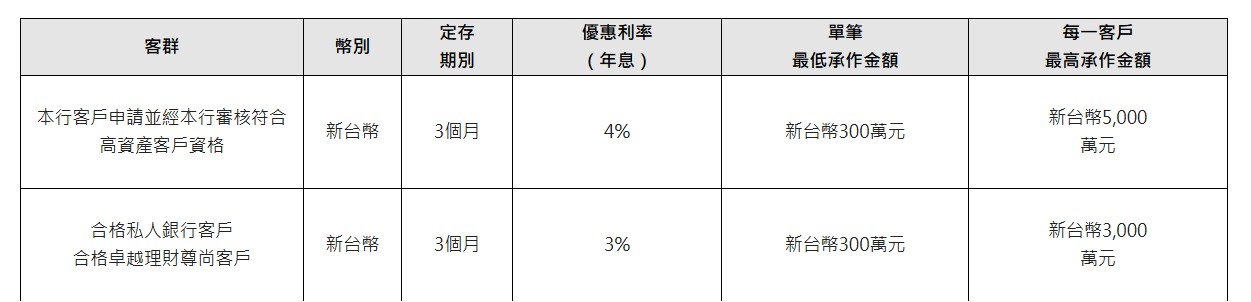 即日起至9月30日,滙豐銀行也為高資產客戶推出3個月新台幣定存,年息最高4%的重磅優惠。單筆最低承作金額300萬元,每一客戶最高承作金額5000萬元。