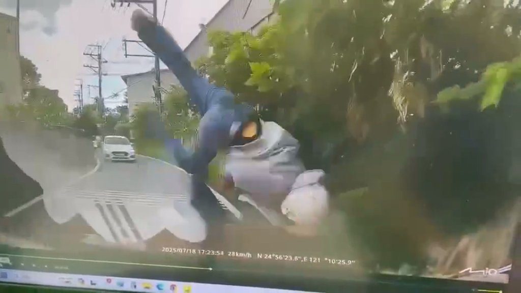 網友在爆廢公社分享影片,指出18日下午5點多,行經桃園楊梅桃102鄉道,靠近高榮路時的彎道,一名騎士迎面而來,直接對撞噴飛。