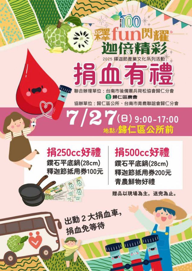 歸仁區農會為配合2025釋迦節產業文化系列活動精心規劃生命之源、獻出愛心捐血公益活動,現場參與捐血活動就有好禮贈送,凡捐250cc送好禮鑽石平底鍋(28cm)釋迦節抵用券100元,500cc送好禮鑽石平底鍋(28cm)釋迦節抵用券200元,現場還有青農準備鮮物好禮贈品以現場為主,送完為止。