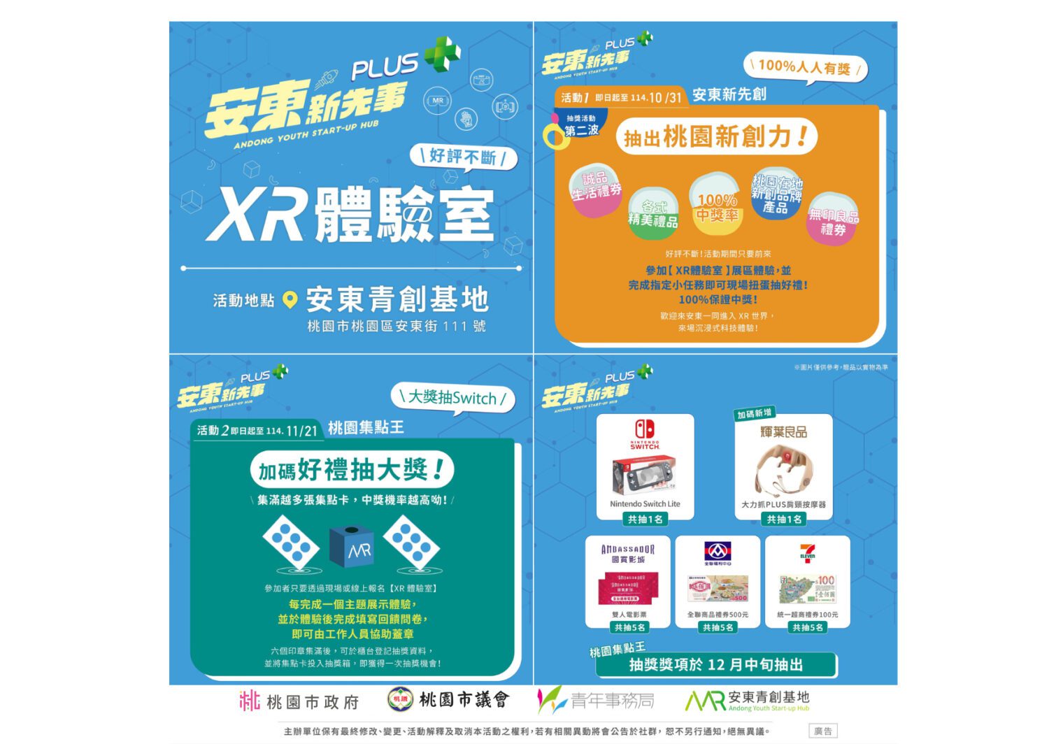 活動已開跑,各檔期時間詳參桃園安東青創基地活動通頁面 https://p.accu.ps/7vc6mx ,安東基地XR體驗館地址在「桃園市桃園區安東街111號」,詳細活動資訊請洽03-335-5530。或關注桃園市政府青年事務局官網 https://youth.tycg.gov.tw/ 及桃園青創事FB粉絲專頁 https://psee.io/5cn56h