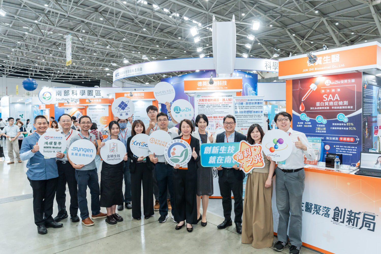 南科12家參展廠商各具特色,產品橫跨多元面向,包括診斷試劑、藥物載體、保健食品、醫美修護、再生醫療與AI篩檢等從預防到治療的完整鏈結。「富田永續生醫」研發脂質奈米粒子製程平台,提供新世代API包覆解決方案,應用於藥品與美妝保健品;「亞洲基因」開發登革熱、肺結核、A/B流感多項先進檢驗試劑;「俊質生醫」利用AI生物判讀軟體,分析血液中SAA蛋白質,篩檢大腸癌與胃癌,準確率高達9成;「德英生技」推出植物藥品、保健食品與功能性保養品,護眼產品具備全方位補給功能;「鴻曜醫學」研發MiSaver®幹細胞靜脈注射產品,針對急性心肌梗塞具良好安全性與療效;「創甡生技」專注魚皮轉化生醫級膠原蛋白,應用於大面積傷口修復;「生展生技」深耕益生菌與保健原料研發,結合精準醱酵與功效實證,更以創新思維設計多元劑型,兼顧產品健康與美味;「訊聯生技集團」建立跨物種外泌體巨量資料庫,訓練AI預測模型,創造外泌體應用新商機;「微體生醫」開發非侵入性尿液檢測肺癌分子標記技術,提供便利輔助診斷工具;「健鑫生醫」研發含銀離子的透明凝膠,專用於傷口照護,具優異抑菌效果;「金穎生技」深耕微生物發酵超過30年,具備菌株篩選、培養基最適化、發酵策略、萃取純化等核心量產技術;「建誼生技」專注於ADC等新藥,提供從開發至GMP製造的整合型CDMO服務。