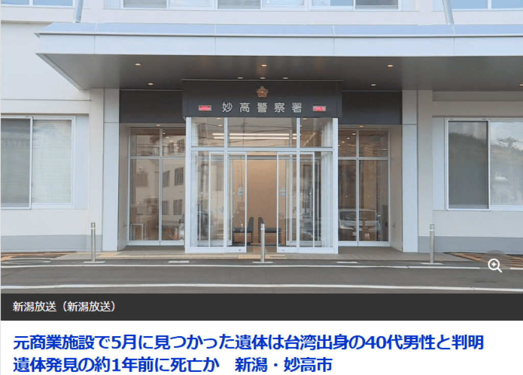 2025年5月,有民眾到妙高市一棟曾作為商業設施的建築物內試膽,結果在裡面發現白骨化的遺體,經確認為一名來自台灣的40多歲男性,警方認為非他殺無可疑之處。