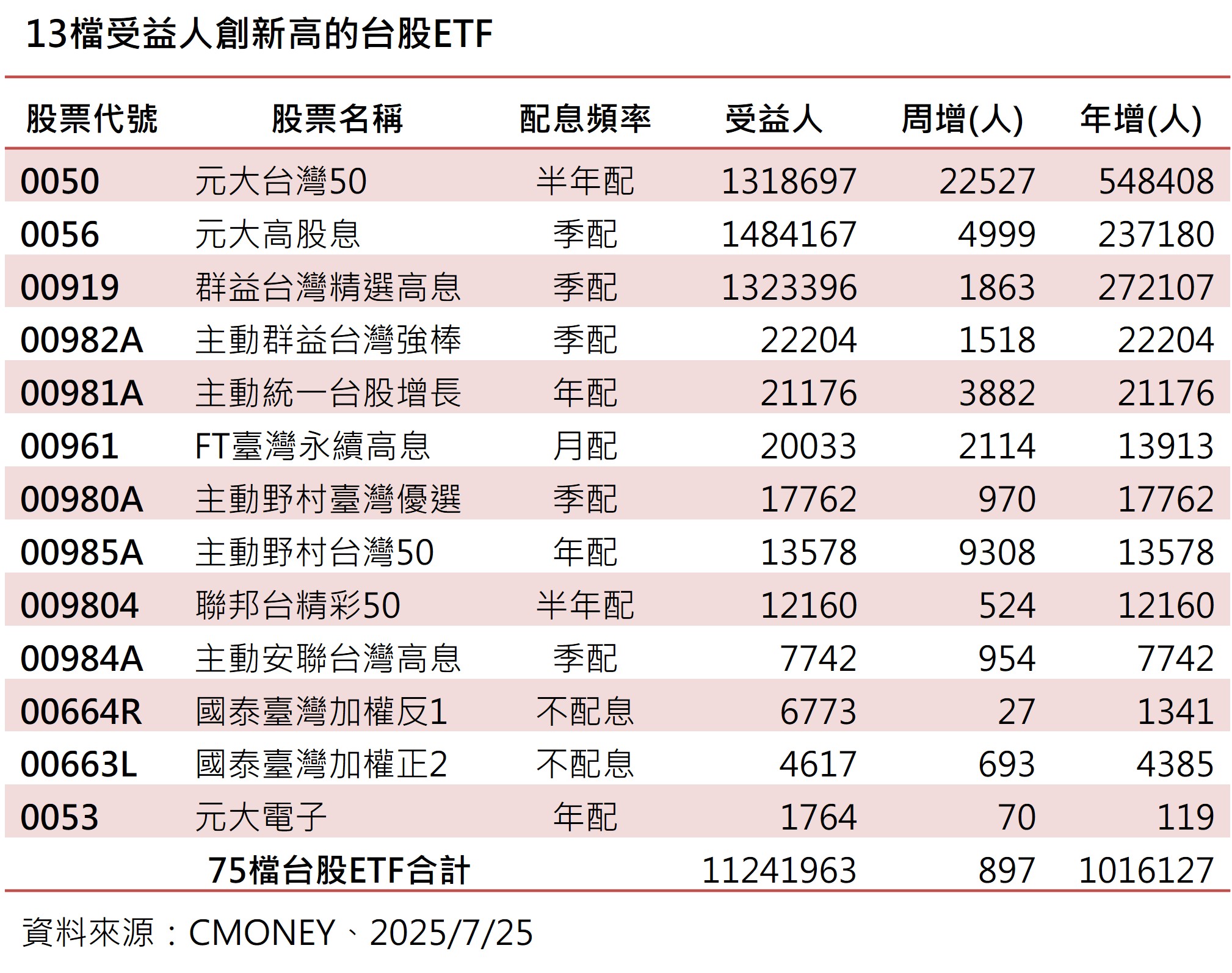 台股ETF也依舊強強滾,包括群益台灣精選高息(00919)、主動群益台灣強棒(00982A)、元大台灣50(0050)、元大高股息(0056)、主動野村臺灣優選(00980A)、主動統一台股增長(00981A)、主動安聯台灣高息(00984A)等13檔,持續受投資人青睞,受益人數創新高。