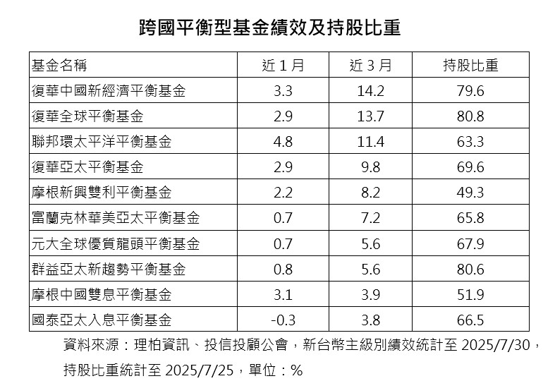 復華投信指出,全球股市下半年以來擺脫關稅不確定性,呈現驚驚漲走勢,部分市場屢今年來新高,強調股債彈性配置的跨國平衡型基金,也隨著市場風險情緒回穩,操作轉趨積極。