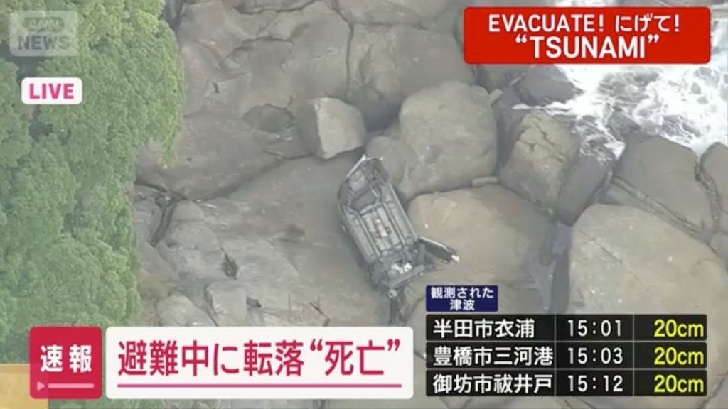日本海嘯警報引悲劇 三重縣58歲婦駕車避難墜崖亡.(圖/翻攝)