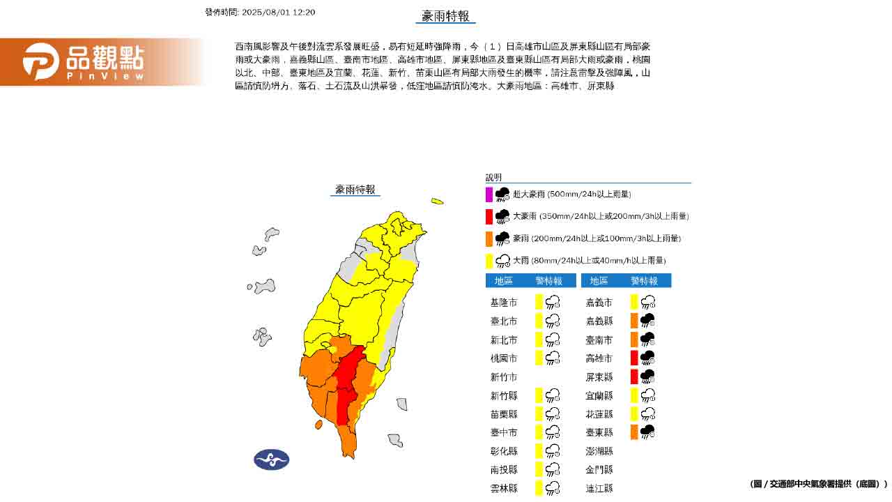 受西南風影響,台灣中南部地區近日持續降下豪雨,造成多處淹水及土石流等災情。中央氣象署今(1)日持續發布豪雨特報,針對高雄市、屏東縣等10縣市發布豪、大雨特報,並對台南市、高雄市、屏東縣、台東縣發布大雷雨即時訊息。