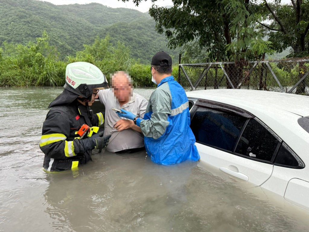 消防隊員到場發現1輛自小客車泡在水裡面動彈不得,水深及腰,消防人員徒步涉水靠近車旁,協助男子打開車門將他救出。初步了解,駕馬經過該積水路段,隨即因車子熄火報案求助。