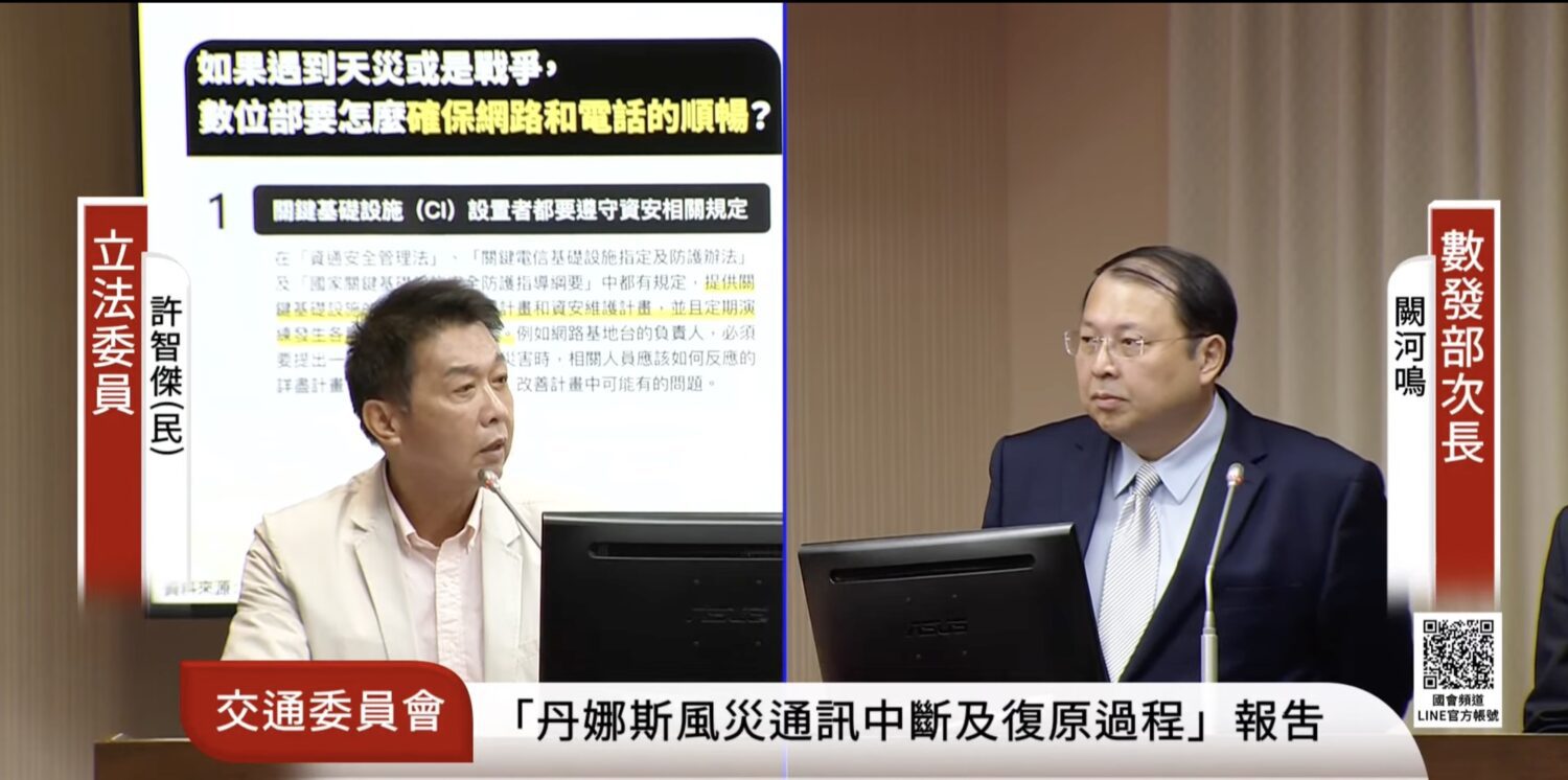 【焦點時報/記者張淑慧 報導】交通委員會召委許智傑今日(4日)在交通委員會針對「丹娜斯風災通訊中斷及復原過程與檢討」安排專題報告。在質詢過程中,許智傑質疑天災或戰爭相關風險的關鍵基礎設施(CI)安全防護計畫。自107年起,每年均擇定關鍵基礎設施進行演練,而今年7月4日才剛舉行演習,卻在7月6日颱風登陸後發生嚴重斷訊問題。此外,國家通訊傳播委員會(NCC)竟然到7月31日才研商風災區域「啟動漫遊服務」的可行性,顯示防護計畫不足且反應速度過於緩慢。