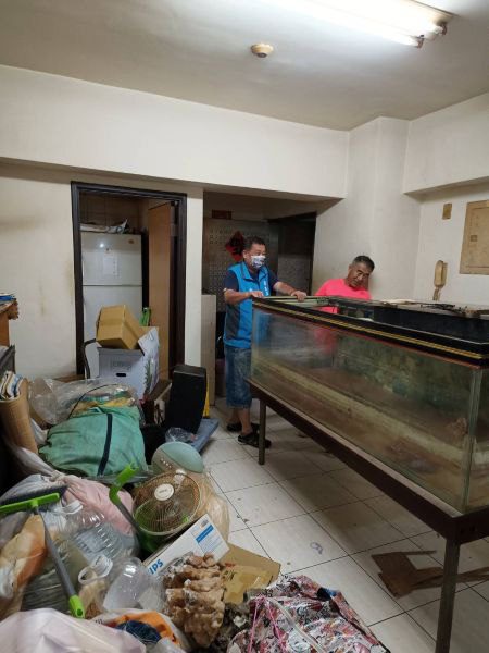 俞先生行動不便,平日生活仰賴同住的弟弟相互照顧,弟弟日前不幸去世,俞先生頓失依靠,生活陷入困境,新竹榮服處鞠宗顯處長獲悉後,立即會同武功里長陳海鋒親自前往探視,慰問同時實地察看其居住情況,發現家中堆積多年雜物,不僅行進動線狹窄,更存在安全隱患,令人憂心。