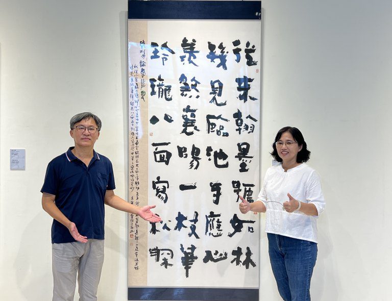 ▲彰化縣美術家接力展第115棒「大塊無盡—張倍源書法創作展」,即日起至8月24日在縣立美術館展出,張倍源老師與文化局長張雀芬歡迎藝術同好一同前來觀賞。(圖╱記者孔亮云翻攝)