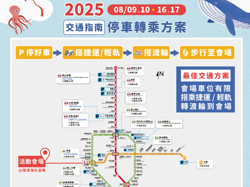 觀光局提醒,無論是搭乘捷運橘線至O1哈瑪星站,或輕軌至C13駁二蓬萊站或C14哈瑪星站,皆可由鼓山輪渡站或棧貳庫輪渡站轉乘渡輪,輕鬆抵達活動現場。活動期間除增加渡輪班次外,現場另有安排定點接駁車服務,建議民眾多利用大眾運輸,並攜帶防曬、補水用品,開心出遊也要注意防曬與安全。更多活動資訊請上「高雄旅遊網」官網(https://khh.travel)或臉書粉絲專頁「Fun旗津」(https://reurl.cc/oYdQbV)查詢。(圖/ 高市府觀光局提供)