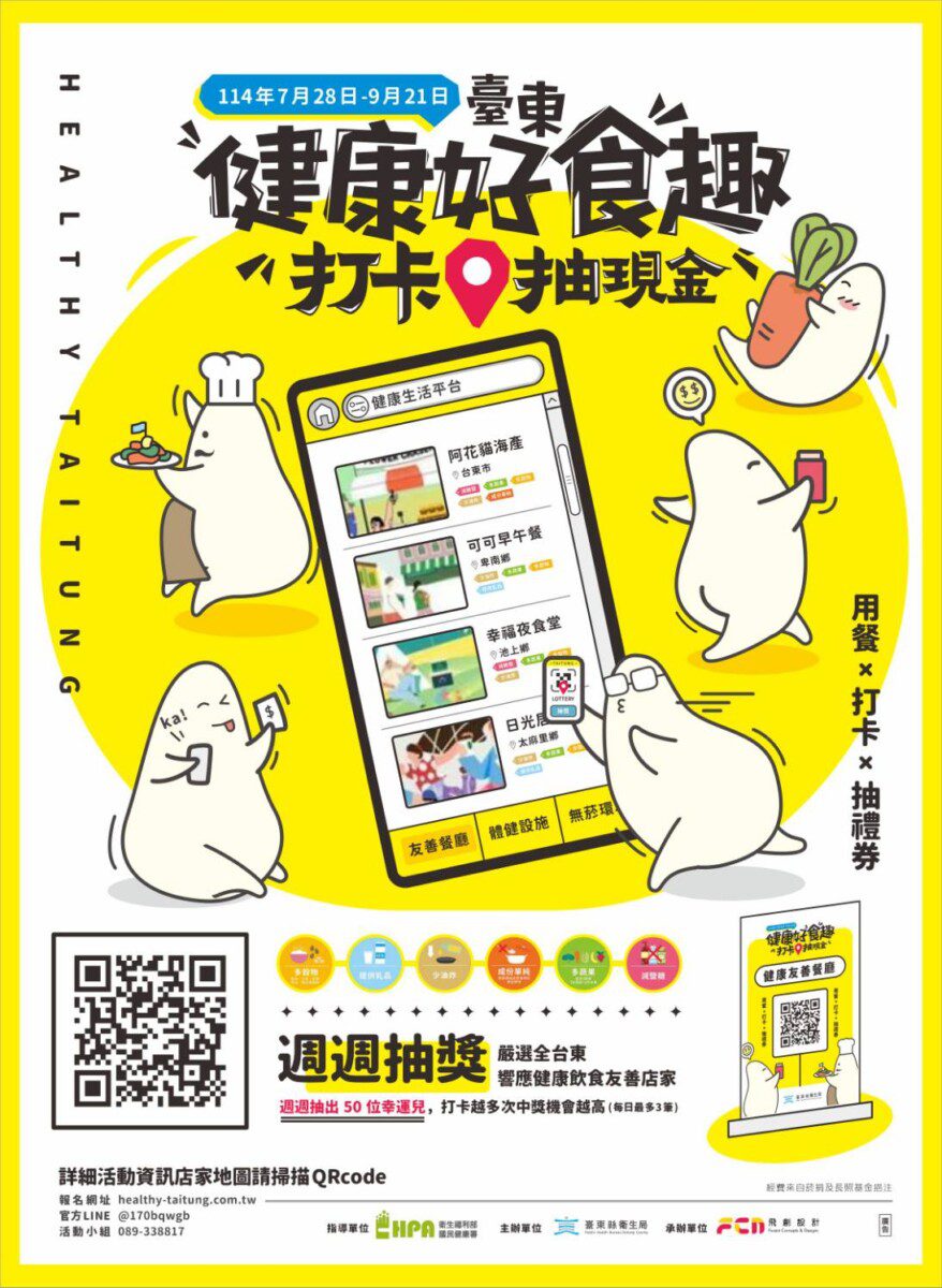 為積極推廣健康飲食概念,臺東縣衛生局推出「114年臺東健康好食趣,打卡抽現金」活動,自即日起至9月28日熱烈開跑!活動期間,只要前往指定的健康飲食友善餐廳消費,掃描店家專屬QR Code上傳照片,就有機會把全聯禮券帶回家!