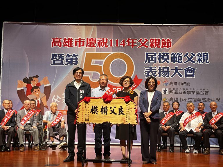 為感念父親對家庭與社會的深遠影響,高雄市政府與財團法人高雄市私立基督教福澤慈善事業基金會共同舉辦「高雄市第50屆模範父親表揚活動」,今(8)日上午在高雄市文化中心隆重舉行。由一群有音樂天賦的自閉症青年組成的「星星兒室內樂團」揭開序幕,接著子女陪伴模範父親出場,並獻花向父親表達感謝與愛意場面溫馨感人,由高雄市長陳其邁頒發模範父親當選賀匾,肯定獲獎父親對家庭和社會的無私奉獻。