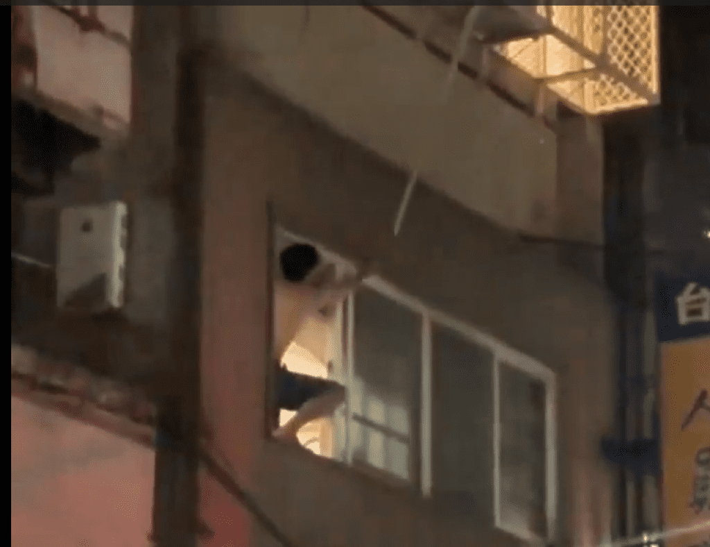 台中一名男子不滿樓上住戶太吵,站在窗戶上拿長棍敲打抗議。翻攝畫面