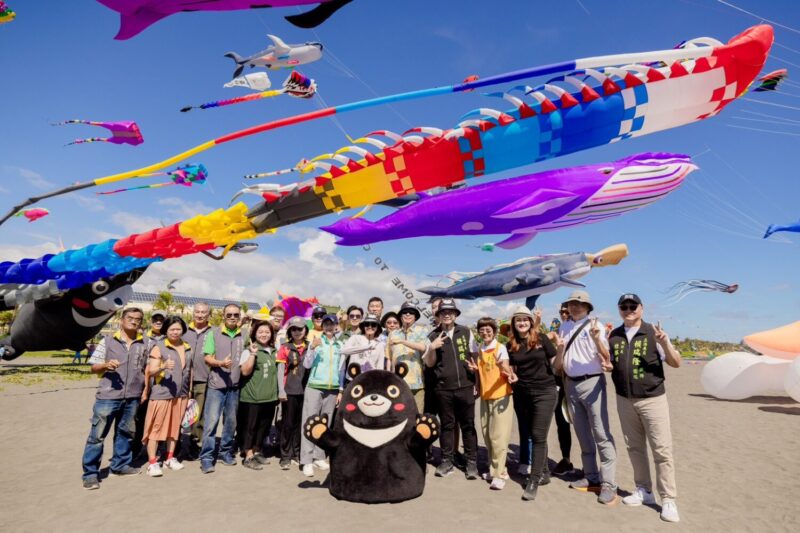 【今傳媒/記者李祖東報導】「2025旗津風箏節暨氣墊水樂園」,今(9)日起連續兩個週末盛大登場,超過130隻各式海洋主題造型風箏翱翔天際,夜間還有夜光風箏、電音派對及火舞表演,從早玩到晚都精采好玩。市長陳其邁下午一身輕鬆帥氣的度假風,化身海灘型男,推薦在地好吃美食及好玩景點;與高雄熊在巨型紫鯨等風箏前擺拍,示範主題風箏網美照姿勢,歡迎各地民眾暢遊旗津。