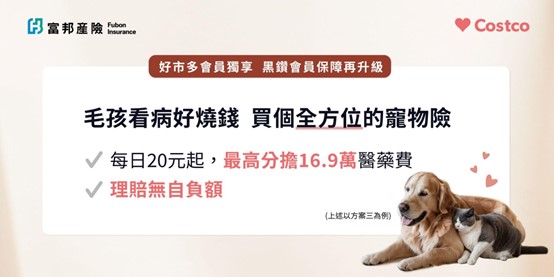 圖說:好市多攜手富邦產險推出專屬會員寵物險方案,理賠無自負額、醫療總額最高可達 16.9 萬元,以及最高 200 萬元的寵物侵權責任,每日保費僅 20 元起。圖/好市多提供
