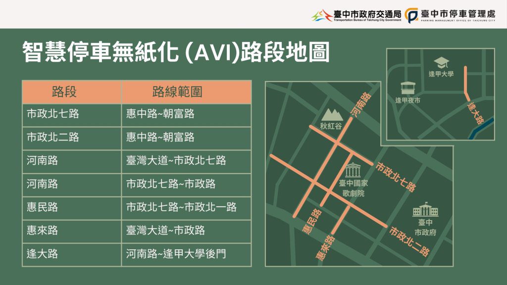 台中市停車管理處指出,智慧化時代來臨,第一階段智慧停車無紙化車格將在西屯區國家歌劇院周邊的市政北七路、市政北二路、河南路、惠民路、惠來路及逢大路等路段啟用,不開立紙本停車繳費單,民眾停車後即透過影像辨識(AVI)設備記錄車輛的停放時間及計算停車費用,離開車格後可線上即時查詢繳納停車費,路段旁除了設置智慧停車收費告示牌面說明收費時間、停車費用、QR-code線上繳費等,車格內標繪綠色LOGO及「P」標字,經由簡單易懂的標誌及標線方便民眾辨識。