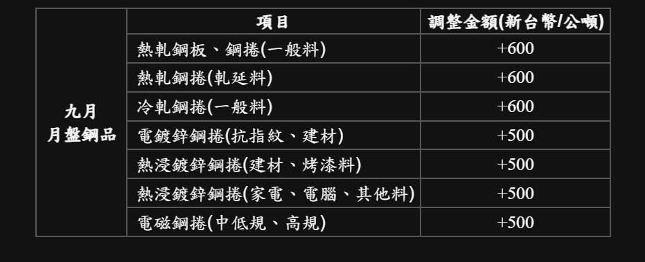 #中鋼九月盤價, 鋼鐵產業調整, 原物料價格上漲, 全球鋼市回溫, 產業支持方案