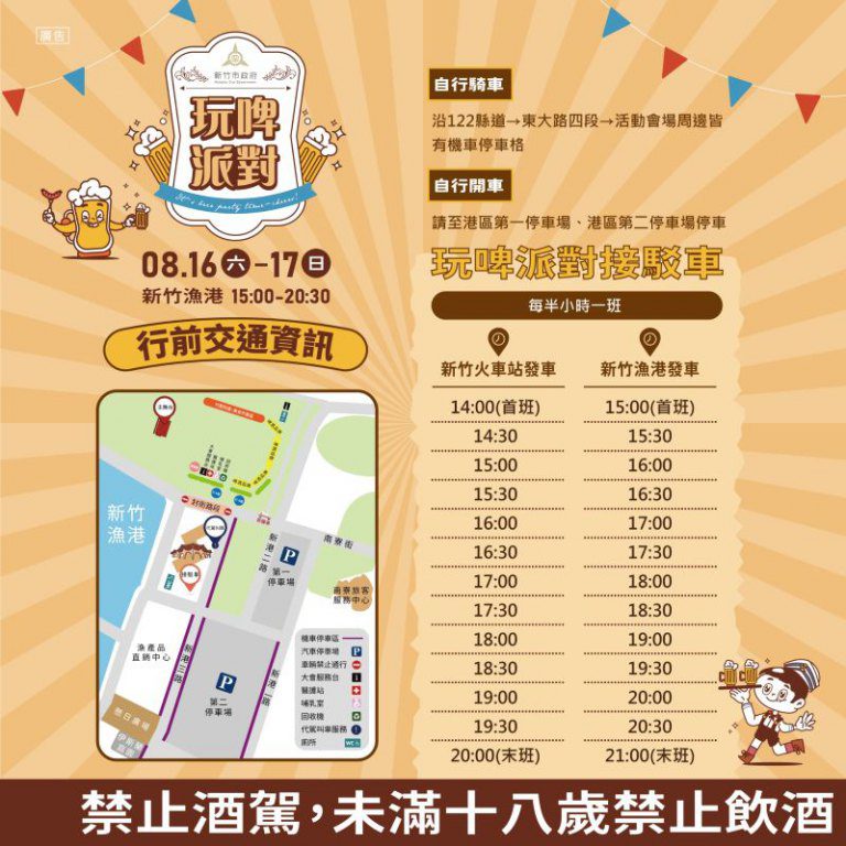 「新竹玩啤派對」將於8月16、17日在新竹漁港隆重登場,17家國內外知名啤酒品牌及多家在地特色廠商,共同打造最火熱的夏日飲酒盛宴,為便利民眾參加活動並鼓勵搭乘大眾運輸前往,市府於活動期間特別提供新竹火車站至新竹漁港接駁車服務,同時周邊也將實施交通管制措施,請用路人多加留意,提早規劃行車路線。