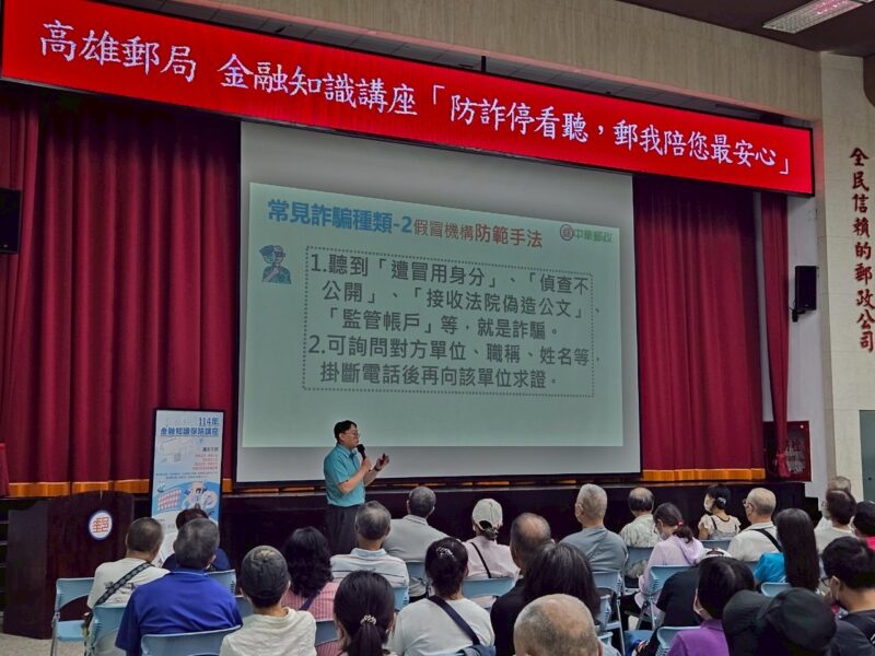 中華郵政(股)公司戮力推廣防詐知識,特於全台各縣市舉辦防詐講座,針對六十五歲以上樂齡儲戶作為邀請對象,發放三千張邀請卡,採志願者報名制。高雄郵局於今(14)日在郵務大樓禮堂舉辦「114年度金融知識講座暨郵政壽險交流座談會」,與110名儲戶進行業務研討及金融知識傳遞。