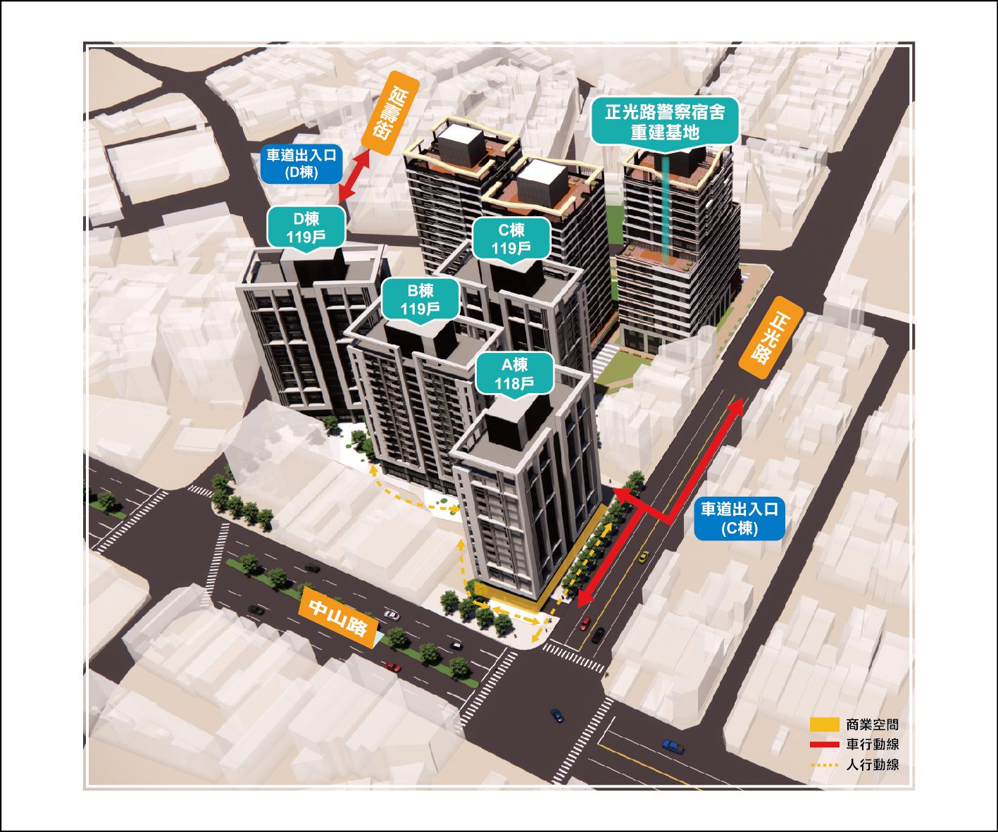 住都中心提及,該案未來將呼應綠建築、零碳建築思維,結合建築設計手法,成為桃園市淨零碳都更建築之標桿,結合正光路警察宿舍都更基地,打造大面積開放空間,形塑舒適友善人行步道動線,打造綠色友善環境。