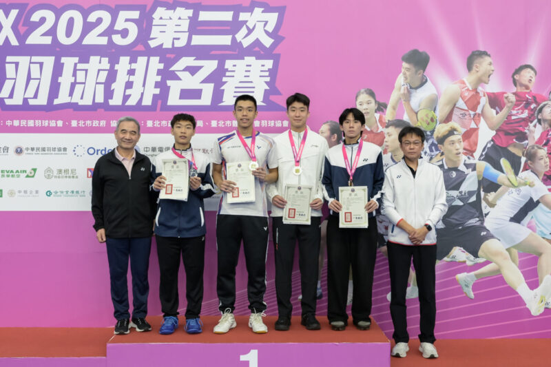 ▲黃俊凱勇奪2025年第二次全國羽球排名賽男子乙組單打冠軍。中華民國羽球協會楊文芳副理事長(左1)與秘書長林怡男(右1)頒獎2025年第二次全國羽球排名賽男子乙組單打前四名。(圖/中華民國羽球協會提供)
