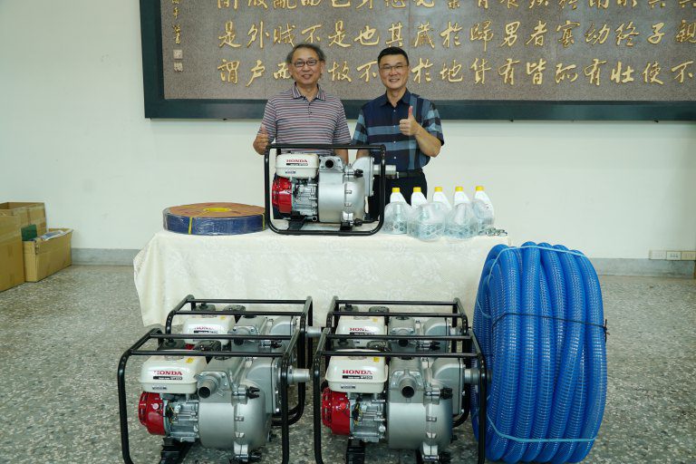 鹿港文化旅遊發展協會20日前往鹿港鎮公所捐贈五部可承受雜物和碎石的日本製本田(HONDA)兩英吋汙水抽水機,為目前市面上最新機種,加滿3公升無鉛汽油,可抽水運作約1小時50分,每分鐘抽水量為700公升、每小時各達42噸,即便有小碎石也能正常運作。