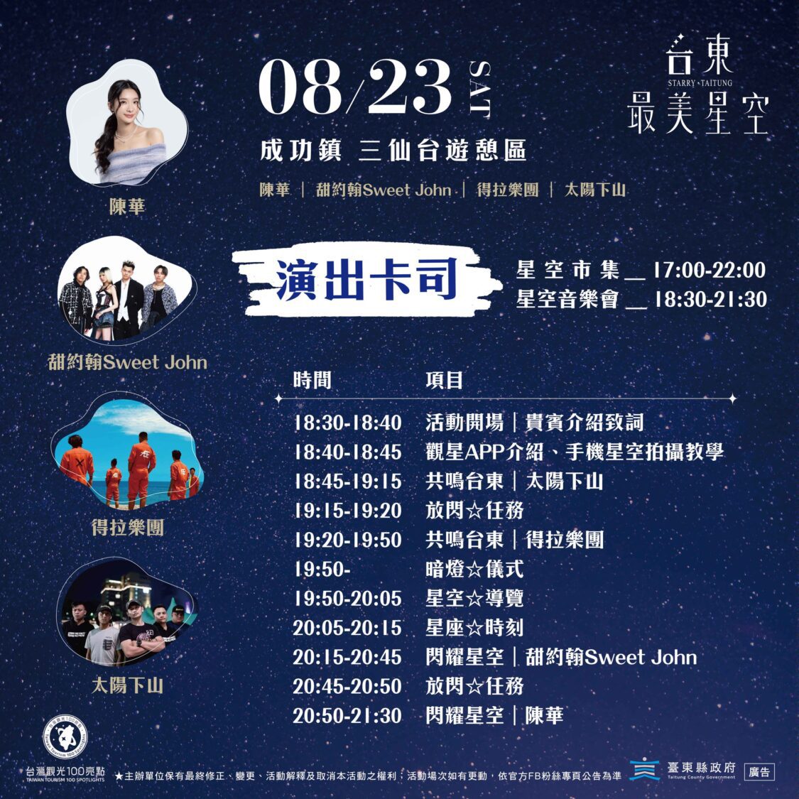 「2025年台東最美星空音樂會」-成功場,將於本週六(8月23日)晚間18:30在成功鎮三仙台遊憩區浪漫登場!活動邀請了創作歌手陳華、入圍第29屆金曲獎最佳樂團的甜約翰Sweet John、清新且充滿生命力的獨立樂團得拉樂團,以及展現在地風情的太陽下山樂團輪番登台演出。在星辰為幕、海浪聲相伴的三仙台,將展開一場星空與音樂交織的夢幻饗宴。