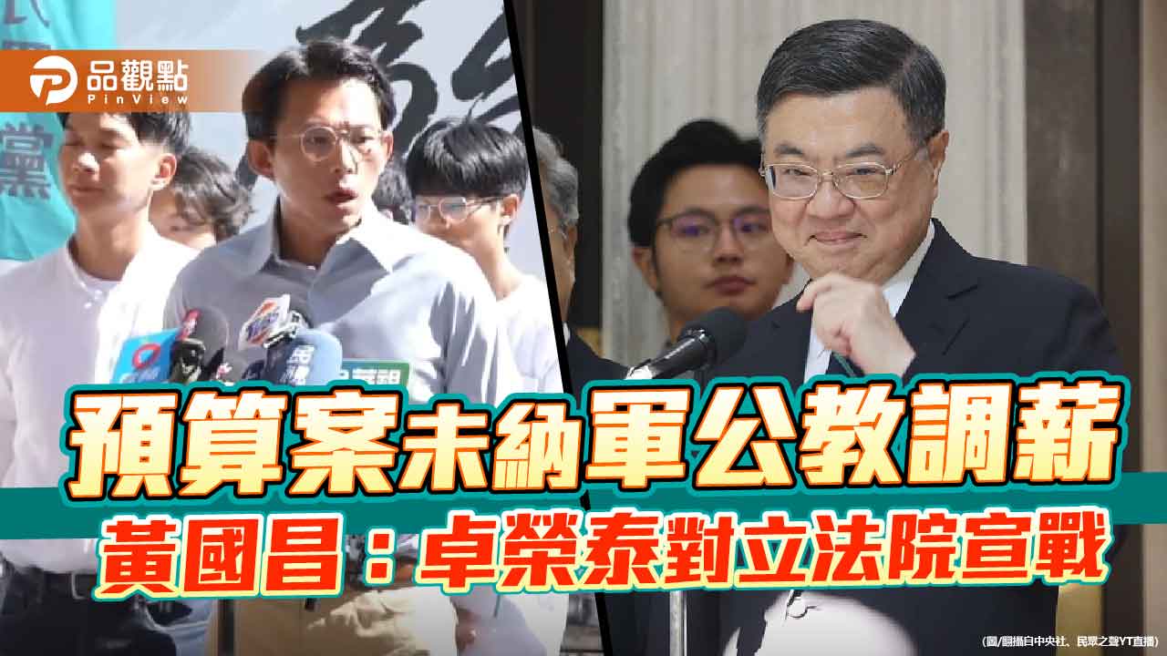 行政院會昨日(21日)通過115年度中央政府總預算案,因未納入軍公教調薪及立法院已通過的警消退休所得替代率提高等預算,引發朝野激烈對立。民眾黨主席黃國昌今日受訪時怒批,行政院長卓榮泰把自己當成「太上皇」,不遵守立法院三讀通過的法律,此舉形同對立法院宣戰。