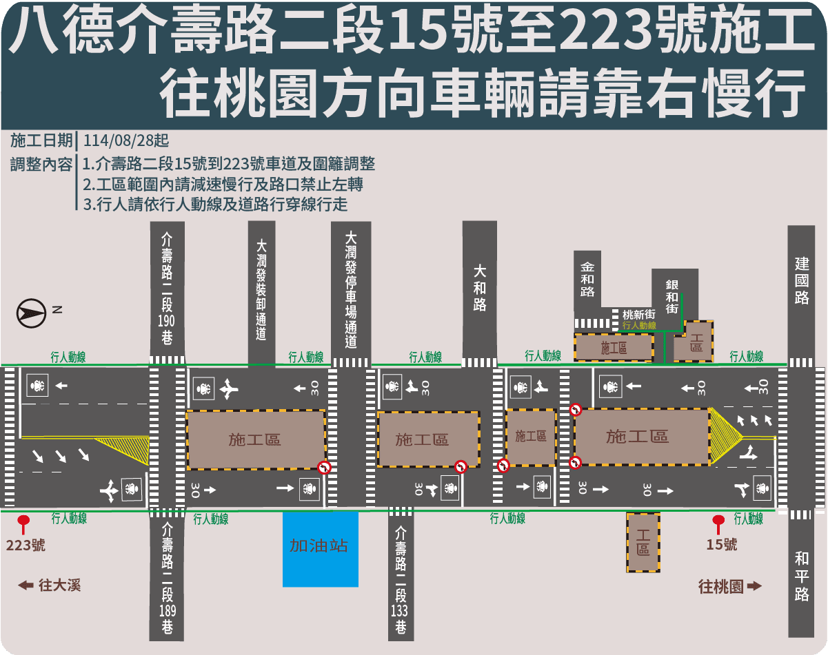 捷運綠線八德介壽路二段15號至223號桃園車道 8/28日起施工