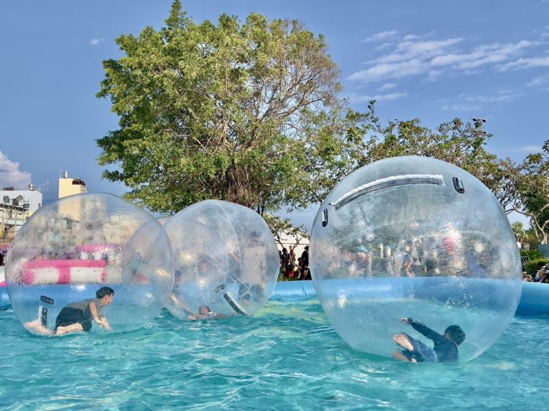 高閔琳進一步說明,大樹水樂園活動現場有 6 座巨型戲水氣墊,包括比籃球場還大的「CACA 象主題巨無霸戲水池」,以趣味的動物造型吸引目光,帶來視覺與玩樂的雙重享受;小朋友最愛的「黃色球池」,色彩鮮豔、充滿歡樂氛圍;長達 20 米的「大型戲水池」,可愛的獨角獸主題,造型吸睛又好玩; 「手搖船」與「水上步行球」考驗平衡與協調力,趣味性十足;更有專為幼兒設計的「粉白主題球池」,像湯圓的柔和配色,十分療癒。此外,還有「旋轉戰鬥機」與「礦山火車」兩座機械遊樂設施,增添動感刺激,讓親子族群在夏日中盡情「放電」。活動結合大樹區公所推出的在地美食市集與警察局觀光騎警隊互動展示,將舊鐵橋濕地公園化身為充滿歡笑與清涼的消暑勝地。