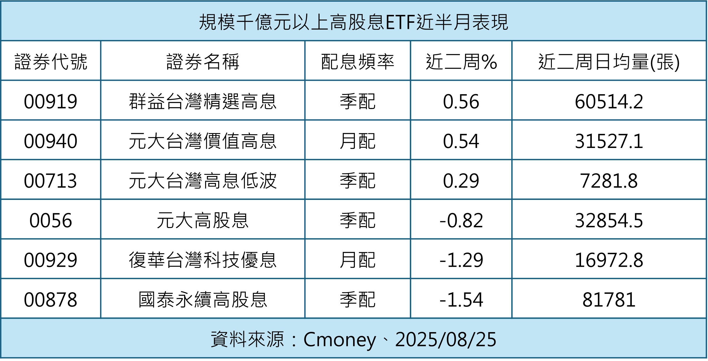 檢視6檔規模千億元以上的高股息ETF,近半月績效強弱不一,群益台灣精選高息(00919)、元大台灣高息低波(00713)、元大台灣價值高息(00940)3檔繳出正報酬。