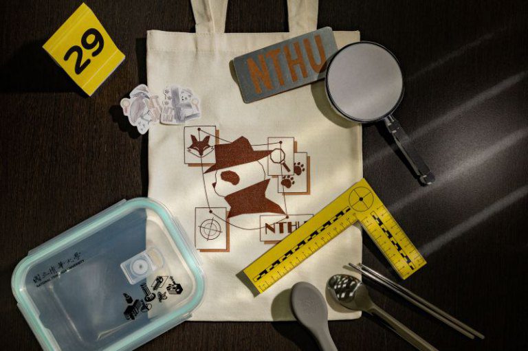 ▲清華大學為新生準備偵探主題禮包以及環保餐具。(圖/中華大學提供) (圖/記者蔣彤雲攝)