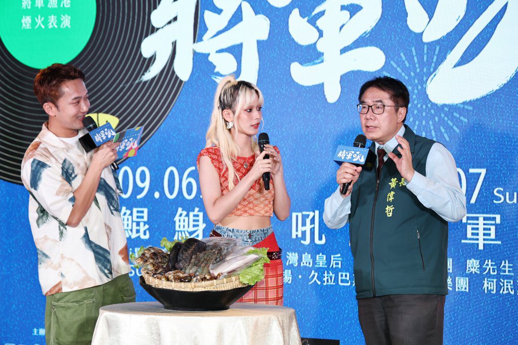 今日市府舉辦啟動記者會,開場由入圍金曲獎最佳新人、台南淵源深厚的 JUD 陳泳希獻唱,空靈歌聲炒熱現場氣氛。黃偉哲更致贈「台南新鮮海味組合」給陳泳希,包含虱目魚、文蛤、台灣鯛、白蝦等漁產,強調台南海鮮品質一級棒,也呼籲大家親臨將軍漁港,不只聽歌、看煙火,還能大啖最道地的台南海味。