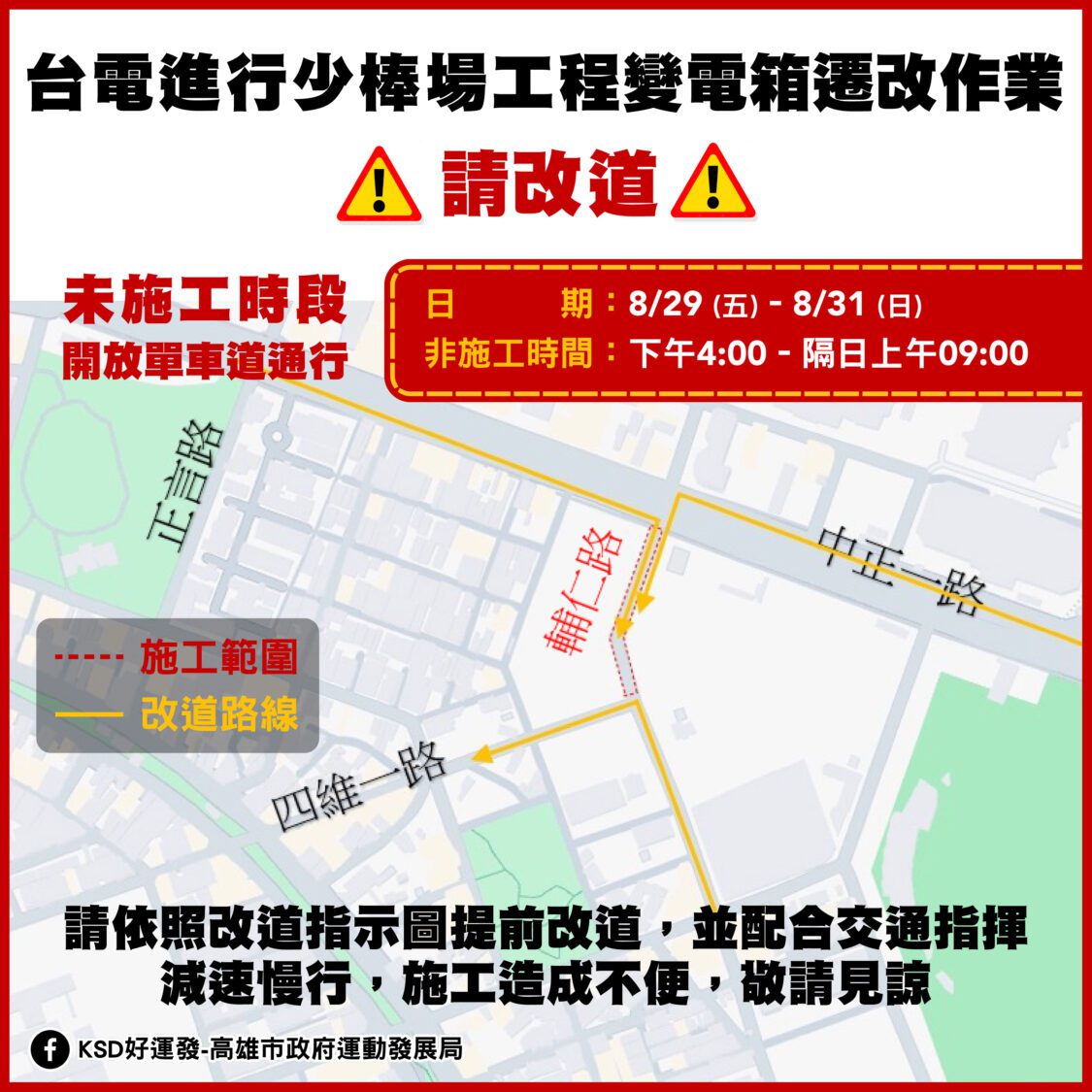 Home高市苓雅區輔仁路台電挖埋管線封路改道 合作媒體高市苓雅區輔仁路台電挖埋管線封路改道 今傳媒 2025-08-28 0Points 0 1 高市苓雅區輔仁路台電挖埋管線封路改道 0SharesFacebookTwitterLinkedinTelegramWhatsAppViber 【今傳媒/記者李祖東報導】 苓雅區輔仁路於114年8月29日(五)至8月31日(日) 上午9點至下午4點進行挖埋管線作業,屆時將封閉輔仁路(中正一路至四維一路間)雙向車道,四維一路前往武廟路需改由正言路、福德路行駛,請用路人提早改道,以節省行車時間。 至於下午4點至隔天上午9點的非施工時段,輔仁路則封閉一車道,僅供中正路轉進輔仁路單向通行,並於路口配置交維人員協助引導車輛改道通行。 今傳媒 What's your reaction? 0 AI 0 Angry 0 Awesome 0 Crying 0 Fail 0 Fire 0 Funny 0 Loved 0 ViVi.AI 0 Wacom 0 Wacom Cintiq 0 Wow 0 伊藤潤二 0 分紅保單 0 台北松山文創園區 0 姚勇傑 0 富邦人壽 0 富邦人壽總經理陳世岳 0 恐怖合作社 0 新一代國民保單 0 最佳保險教育貢獻獎 0 最佳社會責任獎 0 赫綵 0 赫綵設計學院 Trending Right Now! 3 創新研發展現技職教育能量 健行科大奪台灣創新技術博覽會雙殊榮 3 見證藝術世代交會!郭強生贈父親郭軔畫作《樂天啟和》 3 橫越山脈與海岸線 陽光順風車隊傳遞勇氣與希望 3 摩瑟水晶大師之藝 承古創新百年榮光再起 3 從教室到錄音室外的聲音實驗 愛樂大解密以創意開啟音樂未來 3 桃園本土登革熱累計7例 衛生局:有這些症狀快就醫 3 桃園復旦國小班際跳繩比賽活力登場 培養團隊合作精神 Follow Us0InstagramFollowersJoin us on InstagramFollow Us0YoutubeSubscribersJoin us on YoutubeSubscribe0FacebookLikesJoin us on FacebookLike our page0TwitterFollowersJoin us on TwitterFollow Us0PinterestFollowersJoin us on PinterestFollow UsYou May Also Like! 稱「我2個兒子都沒美國籍」 鄭麗文打臉賴清德:各界質疑的是你孫子 農業部改口暫緩進口蛋 侯友宜轟民進黨連蛋都管不好 2025台中爵士音樂節17日登場 15國卡司、百店串聯打造國際城市音樂盛事 中興大學攜10大產業龍頭啟動職涯探索 情境式培育銜接國家核心人才需求