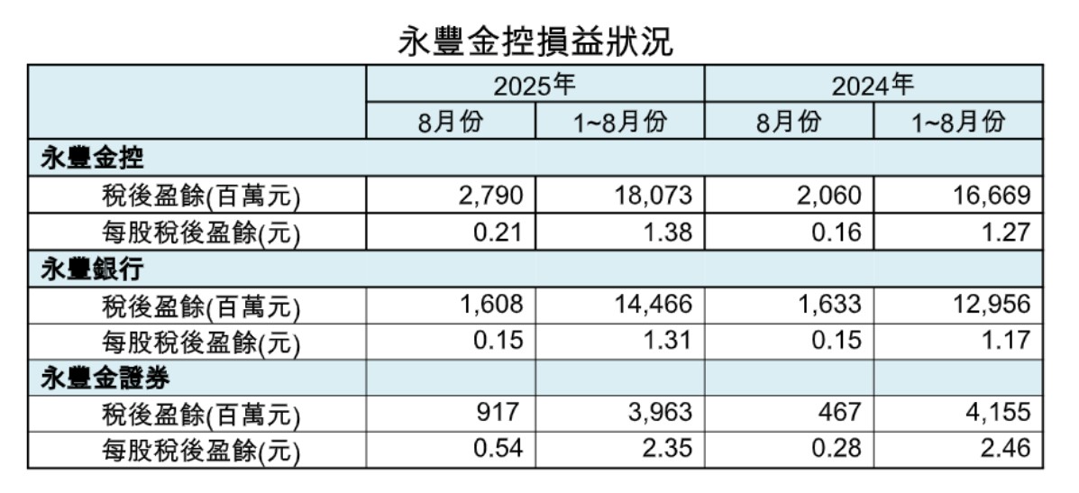 永豐金8月自結稅後盈餘27.9億元,優於去年同月自結的20.6億元;累計今年前8月稅後盈餘180.73億,稅後EPS為1.38元,雙雙優於去年同期自結的166.69億元、1.31元,也創下歷史同期新高。